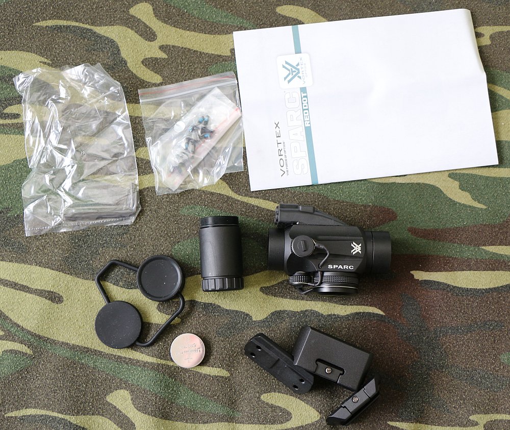 A lot, if you’re used to buying riflescopes! The box comes with 2 low height mounting options, an AR co-witness mounting option at 37mm, plus a combo of the two for a 1/3 co-witness. Also included is the rubber lens cover strappy-thing, 2 CR2354 batteries that should each last a bajillion years, and a screw-on 2X magnifier. The 2X magnifier is really handy for sighting in the red dot and giving a little extra oomph when target shooting, but I prefer the SPARC without it. It interferes with good “2 eyes open” sighting that’s excellent with 1X magnification, and it really narrows the field of view in the sight. Both eyes open sighting and target acquisition is a bit of an eye opener if you’ve been used to 3-9 scopes, and it really speeds up finding and engaging new targets. So I relegate the 2X magnifier to sight-in duty only.