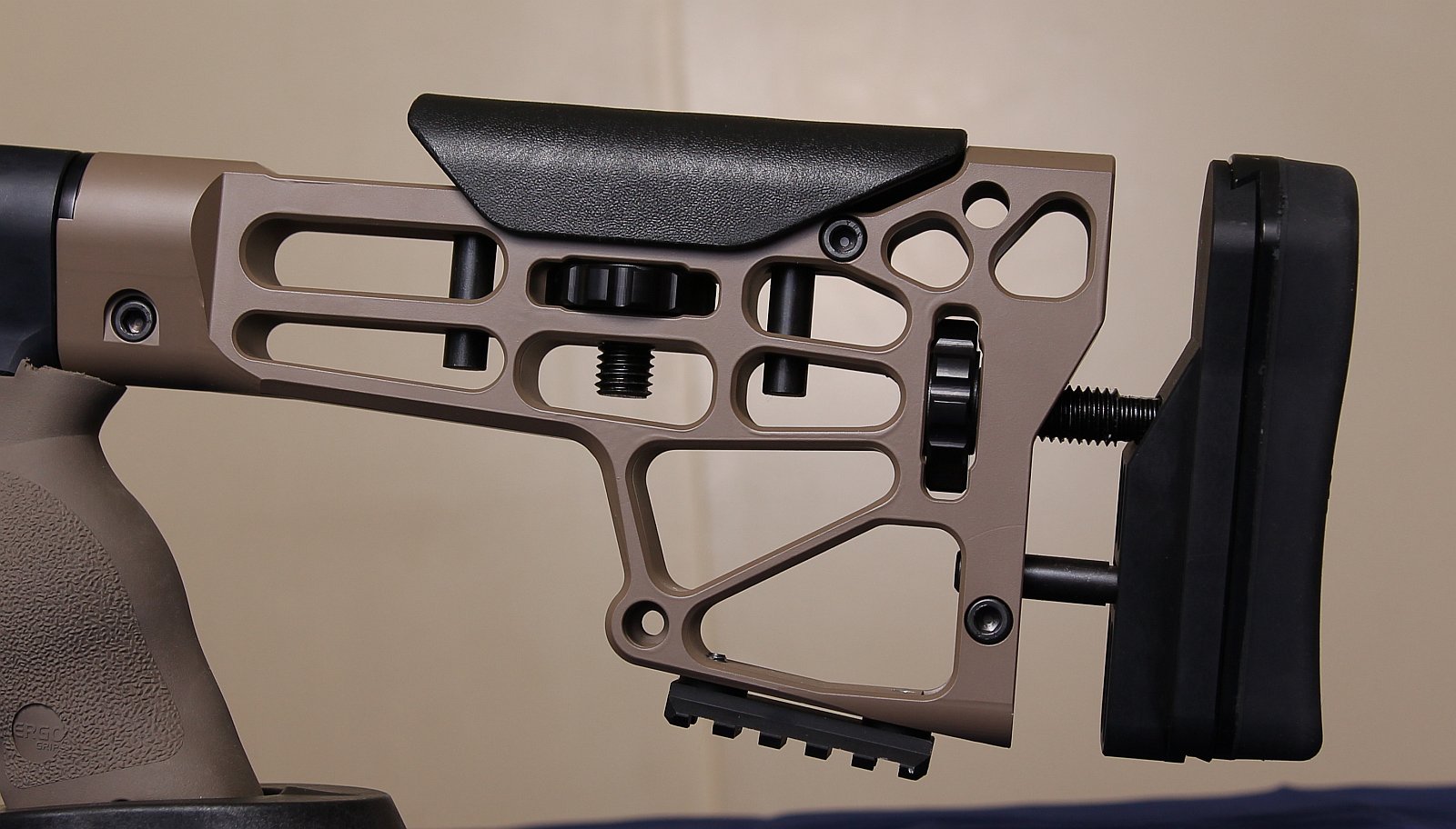 Beyond the improved stock stiffness and possible increase in accuracy that you get with a full aluminum chassis, the AR stock interface at the rear gives access to a whole world of new stocks, and there are mounting points on the sides and bottom of the stock forend to mount picatinny rail or other accessories.