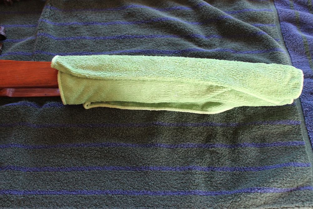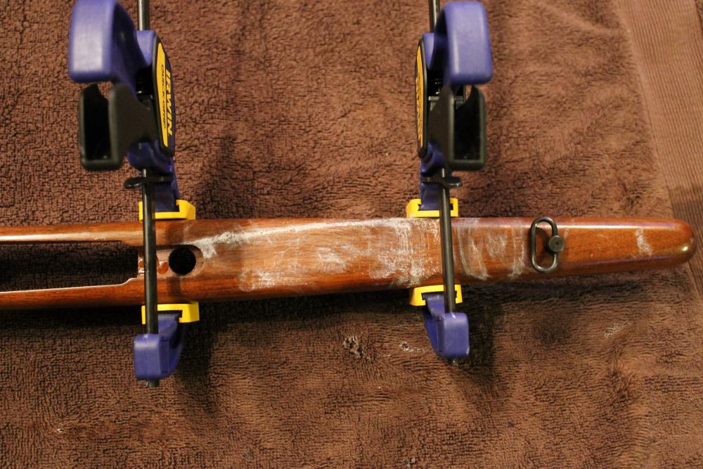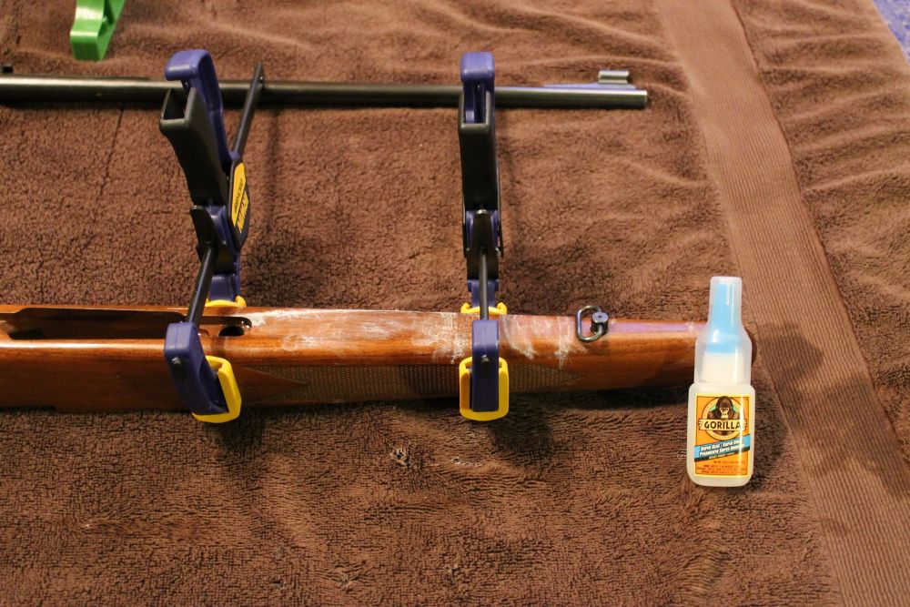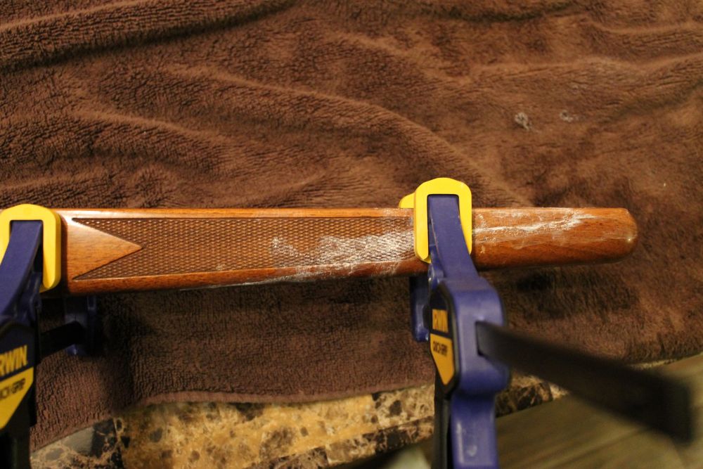I do have to admit gluing a stock seems pretty simple, as long as you don’t glue your fingers together. Make sure that all sides of the crack are covered evenly but do not too much glue as it will seep out and dry on the wooden finish. As you can see in my photos, I have firsthand experience in the disaster of using too much glue. While this was happening, I was picturing my father-in-law loading up his shotgun like he did when I started dating his daughter. I wiped the seeping glue off quickly and clamped the stock together to let it dry for 24 hours. After the glue dried I used really hot, soapy water on a rag and laid it on the glued area. Some of the glue loosened and wiped away easily but not all of it. At least the stock is in better shape than it was before.