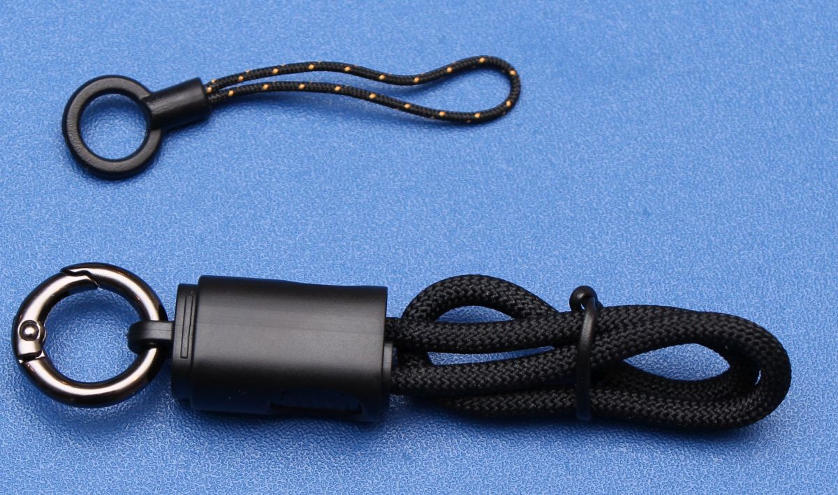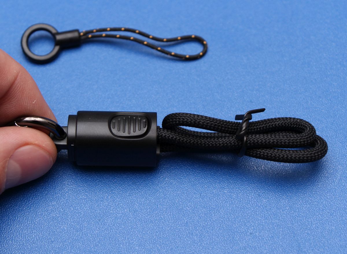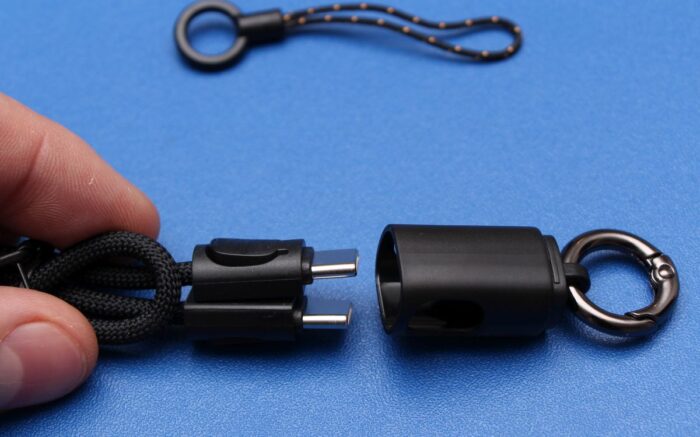 The first thing you’ll notice is the USB-C cable/lanyard. It’s a short, reinforced cable that clips into a connector that then loops through the corner of the housing. It’s a brilliant “quality of life” feature because it ensures you always have a charging cable attached to the unit. No more digging through your electronics pouch at 10:00 PM trying to find a cord.