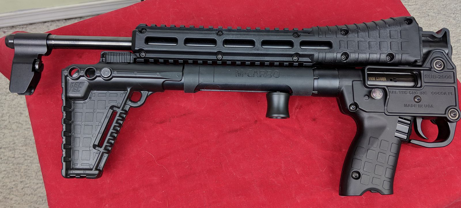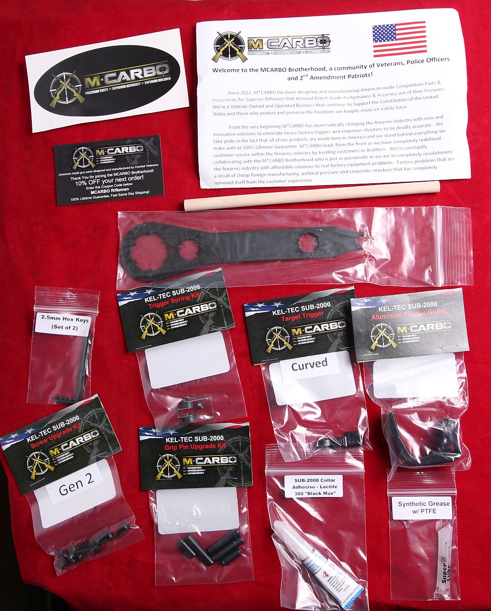 So Kel-Tec SUB-2000 is a really interesting gun, super compact, and it’s lots of fun shooting a PCC in 9mm. BUT, the trigger was kinda poo and overall it seems cheap. I asked M*Carbo if they’d be able to send me some trigger stuff and they sent me the whole bunch of Sub-2000 parts to review. In their care package, they sent: