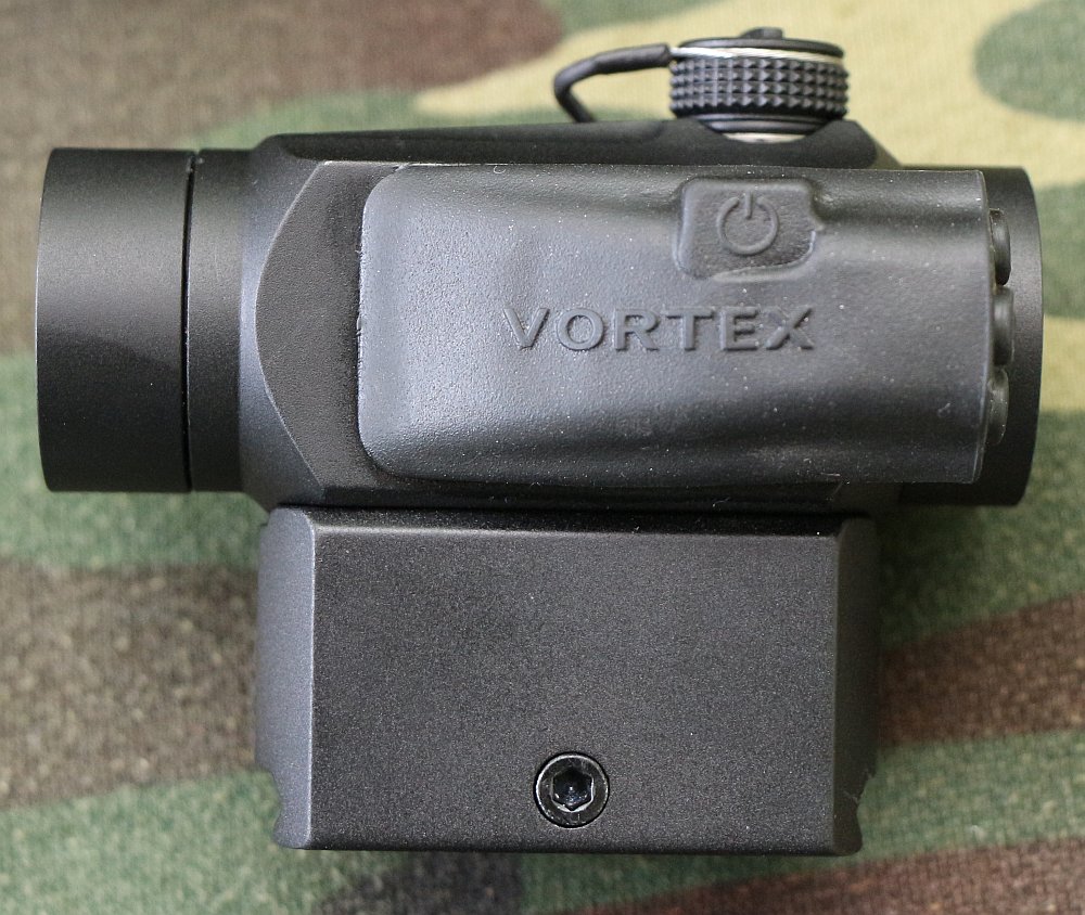 The most critical issue with using a powered optic is how quickly it can be brought to bear and how long it lasts. Thankfully, the Vortex offers a quick touch “on” for the dot. A simple click on the left of the red dot turns it on, while a lengthy 5 second hold is required to turn it off. Battery life at typical brightness is 120 hours, which is pretty good for a midrange optic. A high end optic like an EOTech could last more than 600 hours even on max brightness, while low end optics can come in quite a bit less. The compact 2354 batteries can be easily be fit into a grip hollow or other place on the gun as backup, though I’d be more impressed if the sight used a common CR123 for power.