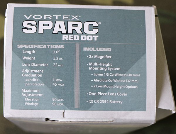 A lot, if you’re used to buying riflescopes! The box comes with 2 low height mounting options, an AR co-witness mounting option at 37mm, plus a combo of the two for a 1/3 co-witness. Also included is the rubber lens cover strappy-thing, 2 CR2354 batteries that should each last a bajillion years, and a screw-on 2X magnifier. The 2X magnifier is really handy for sighting in the red dot and giving a little extra oomph when target shooting, but I prefer the SPARC without it. It interferes with good “2 eyes open” sighting that’s excellent with 1X magnification, and it really narrows the field of view in the sight. Both eyes open sighting and target acquisition is a bit of an eye opener if you’ve been used to 3-9 scopes, and it really speeds up finding and engaging new targets. So I relegate the 2X magnifier to sight-in duty only.