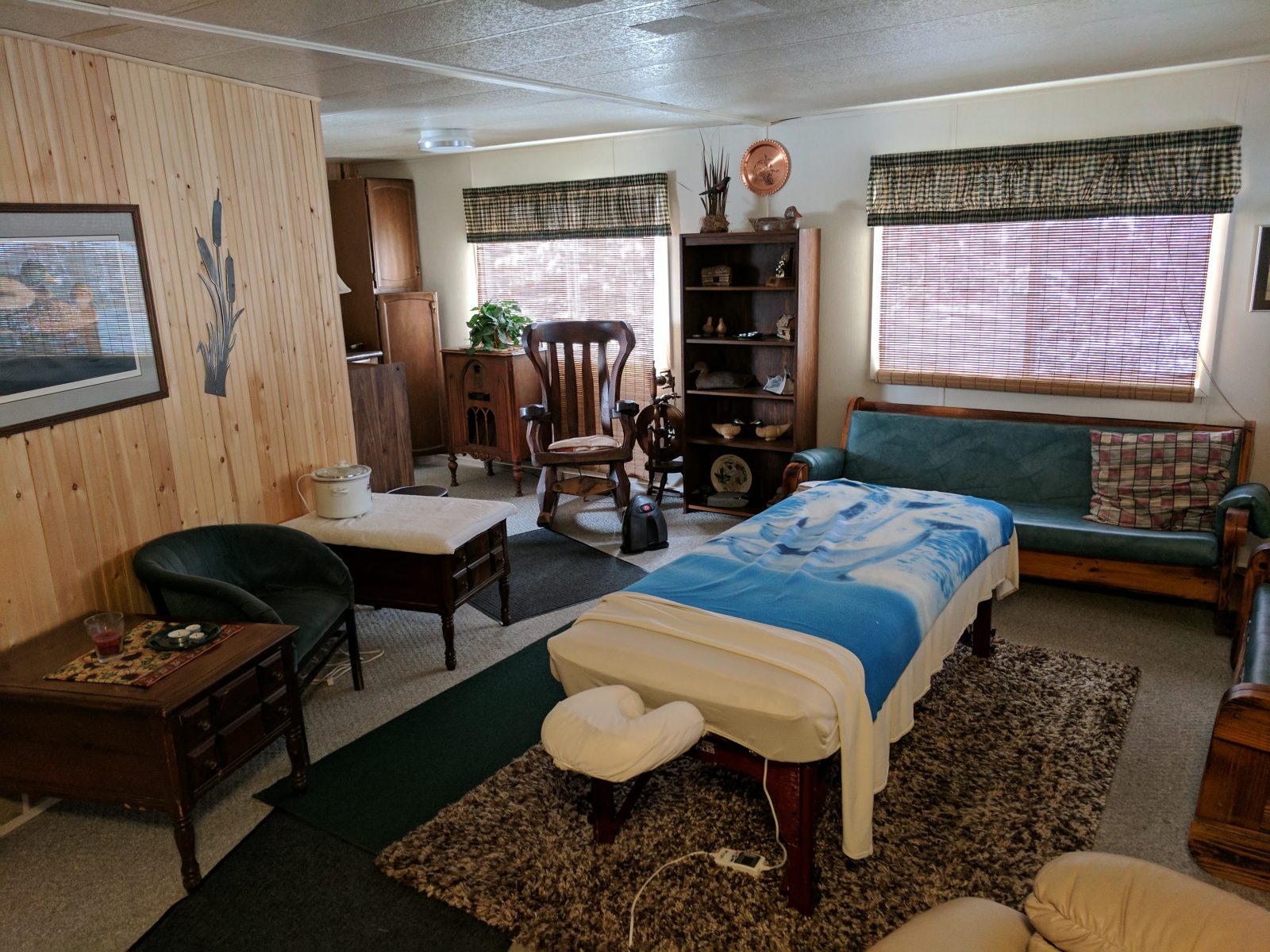 The sleeping quarters has 8 separate bedrooms which each have multiple beds, though they usually keep hunting parties to 8 so that each hunter has a separate bedroom. It also had a separate kitchen and a massage table.