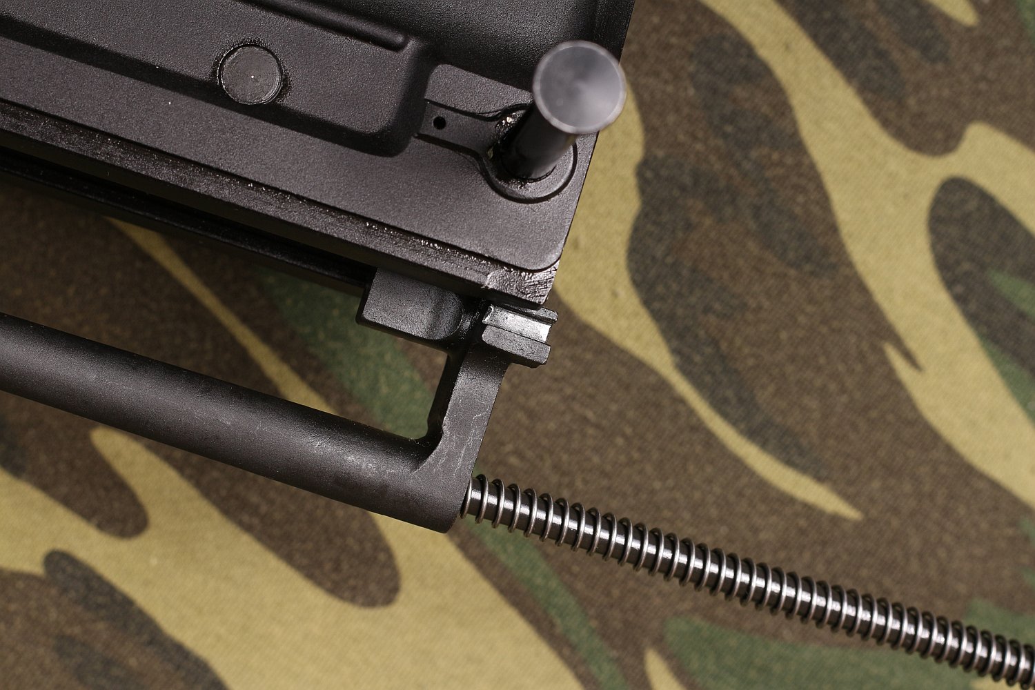 - 压缩保险的弹簧扭到某个位置,拔出保险调节钮。从后面移除扳机组和扳机连杆。