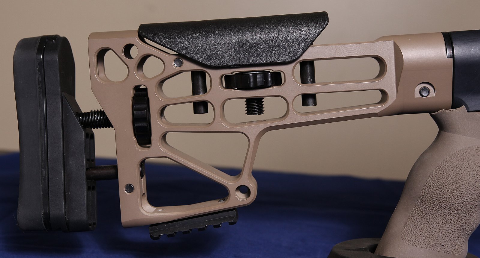 For the stock, I went with MDT’s skeleton buttstock. There are lots of choices out there, but MDT’s offering seemed to be very solid for the price and a bit nicer than the defacto Magpul PRS.