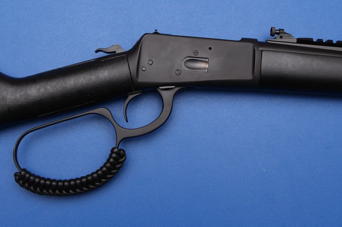 The Triple Black is Rossi’s take on the “Tactical Lever Action” trend. It features a black cerakote-style finish on the metal, a black painted wood stock, and a paracord-wrapped large loop. It’s built on the Winchester 1892 dual-locking lug action, which is inherently strong and smooth, but Rossi has added some modern conveniences (and one major inconvenience) to the mix.