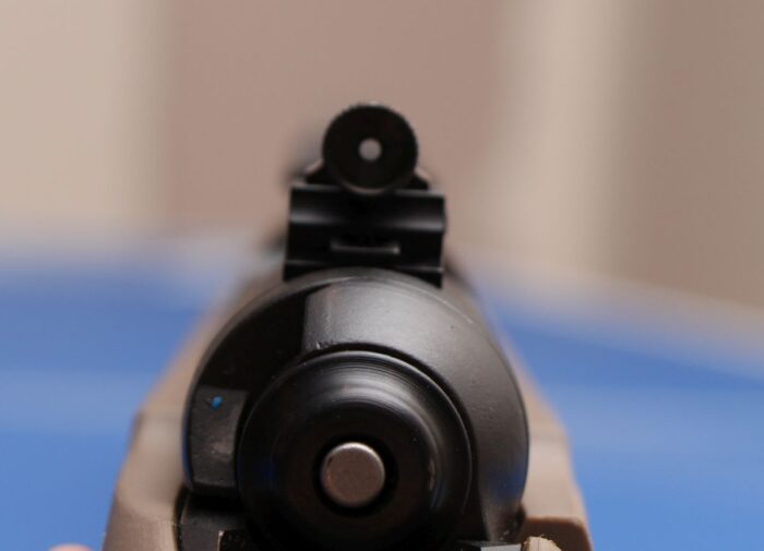 - Features: Muzzle brake, forward mounted rail, peep sights